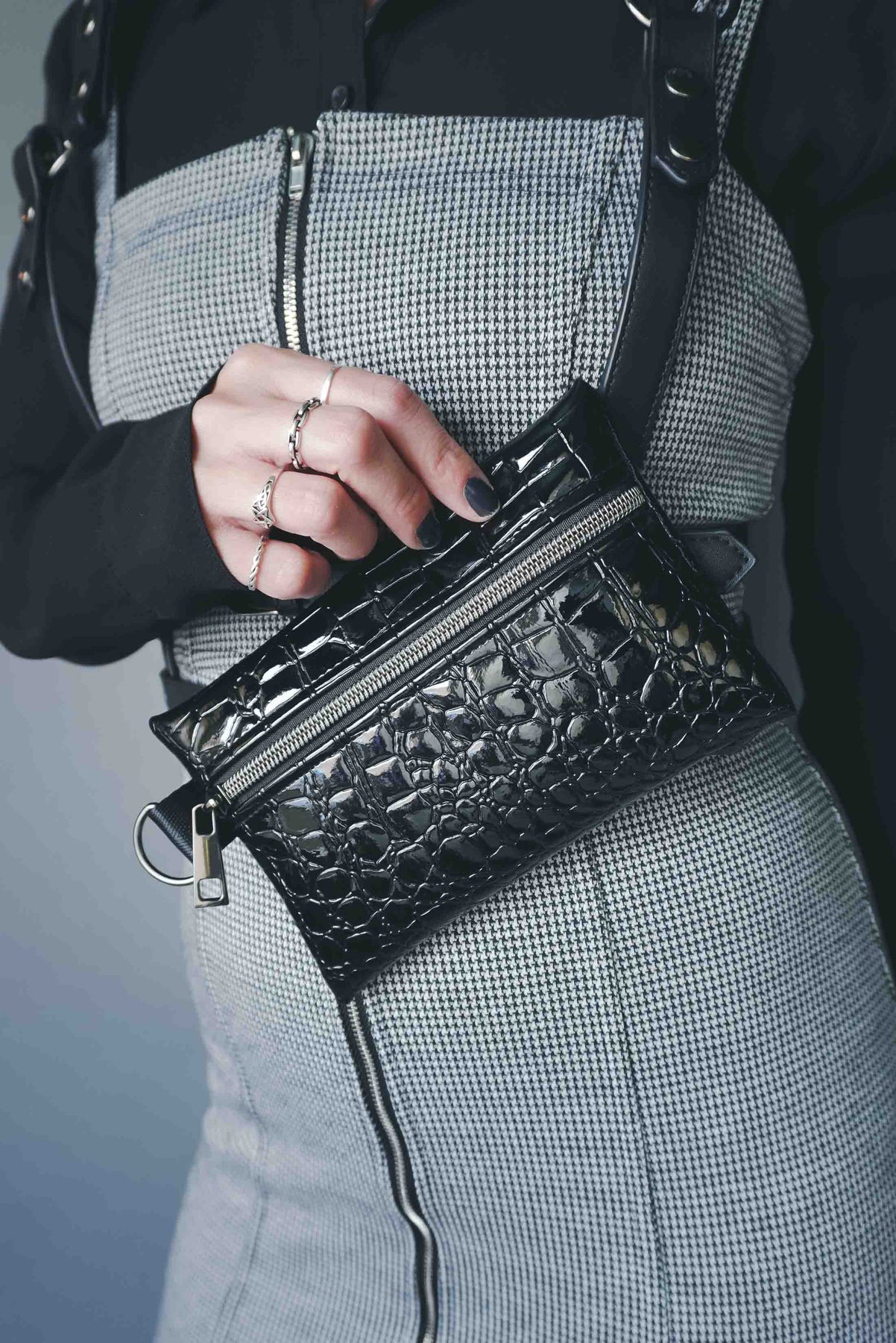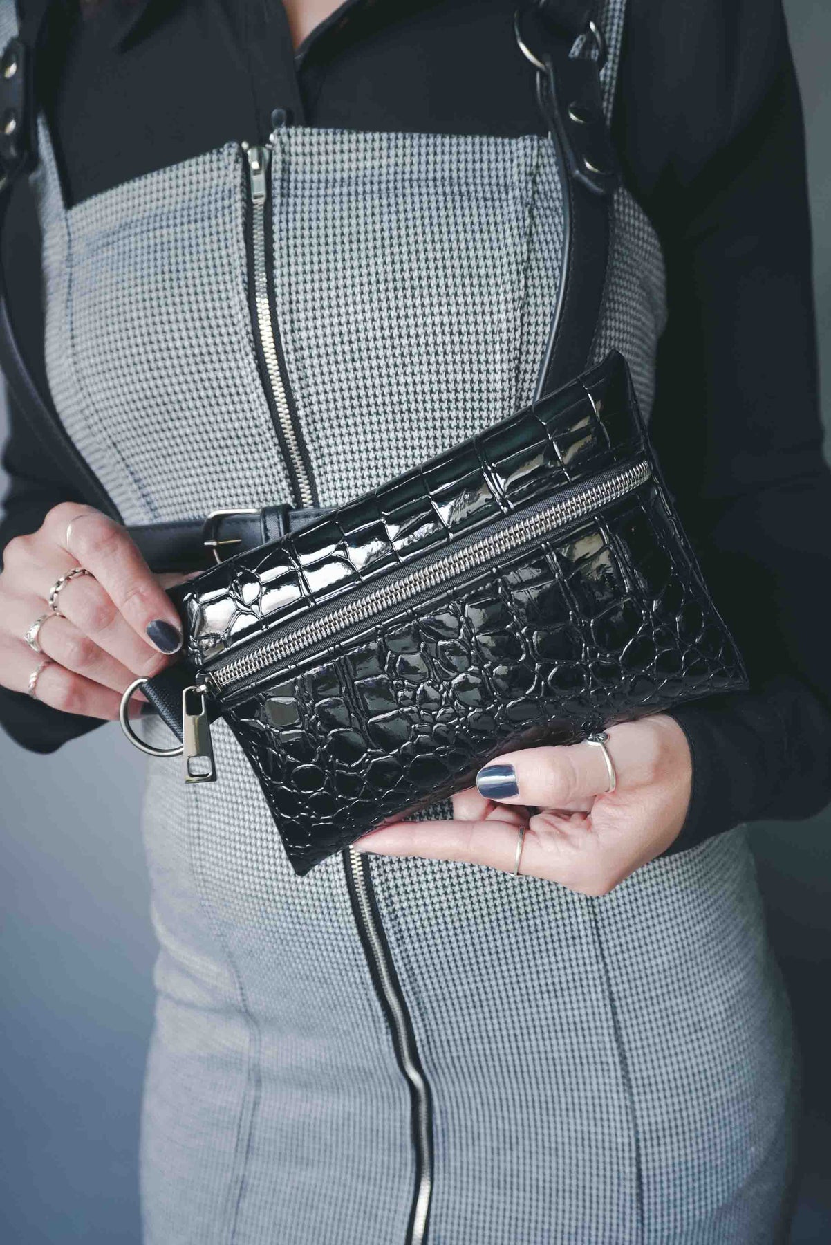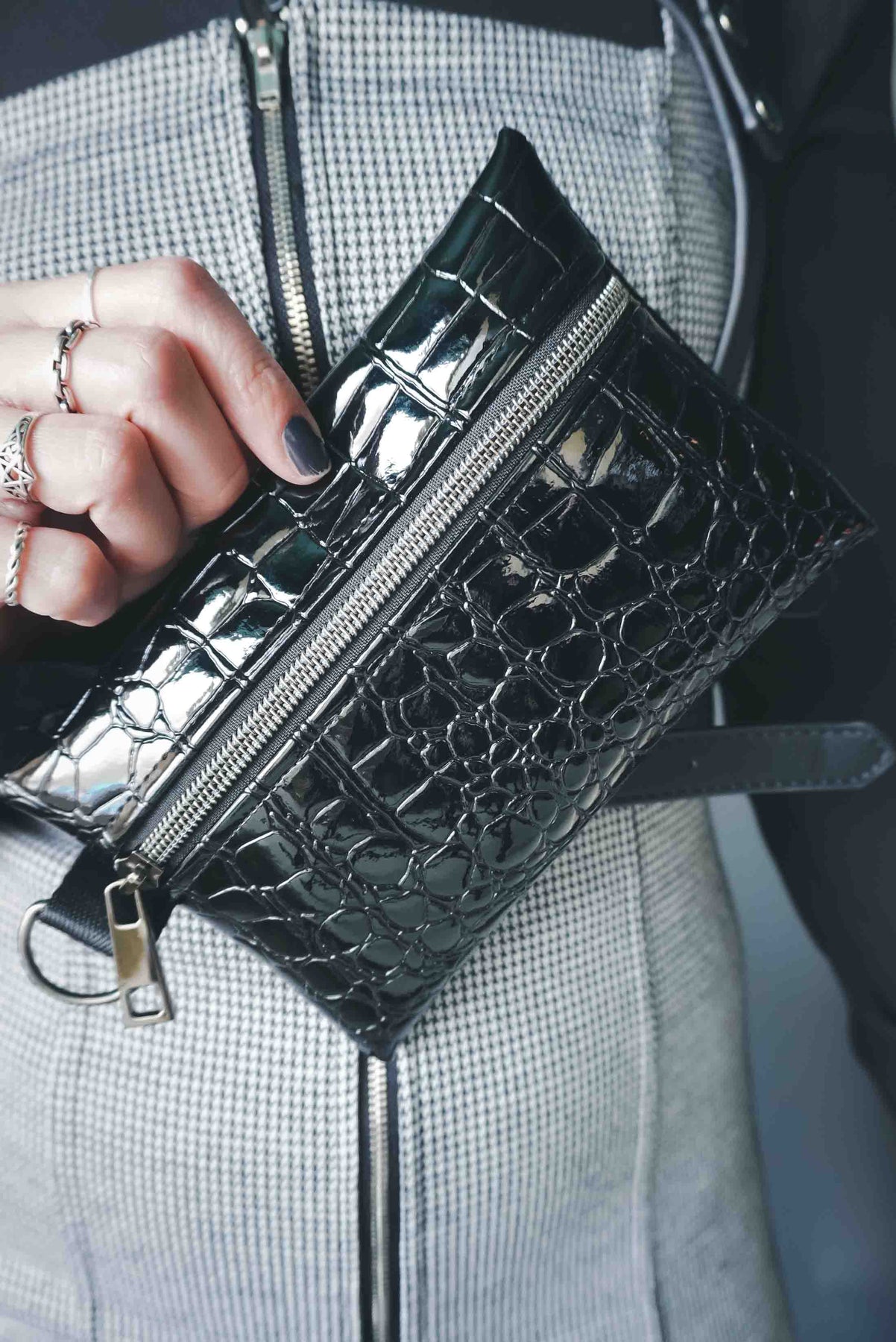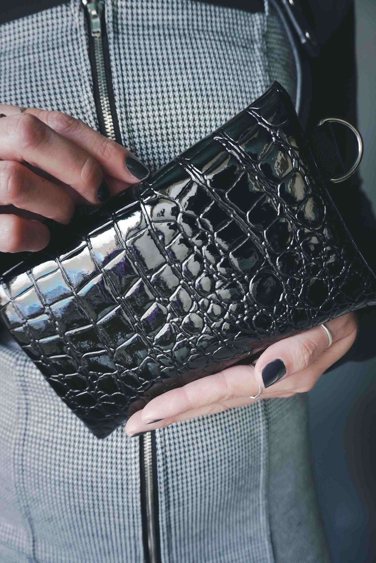 Add a fierce, gothic edge to your everyday carry with this Black Alligator Small Pouch Bag. Crafted from glossy black patent alligator vinyl, it’s bold, sleek, and unapologetically dark. The gunmetal hardware gives it that extra attitude while the D-ring detail makes it easy to clip onto your favorite bag or keychain.