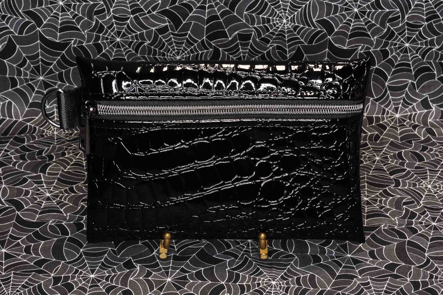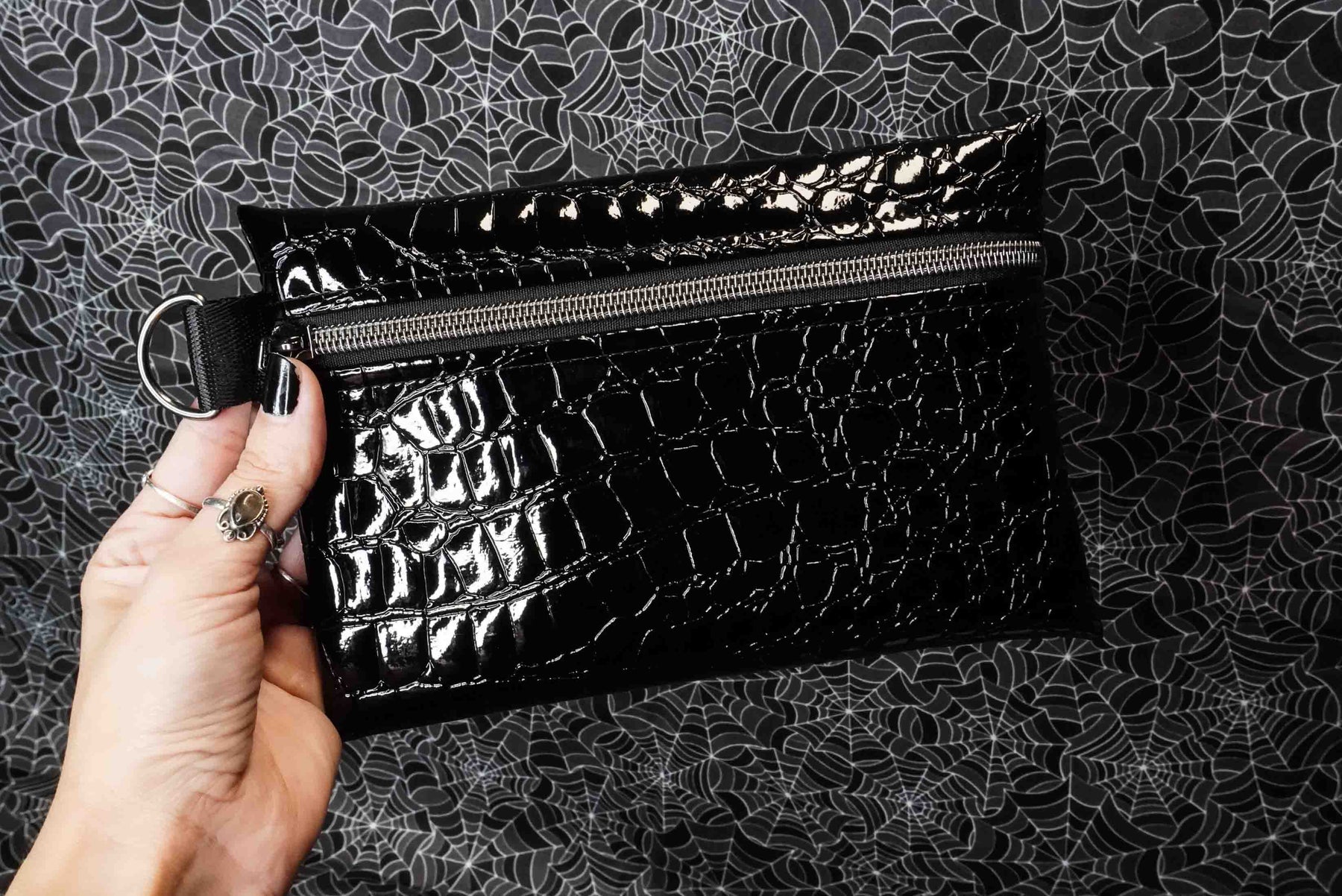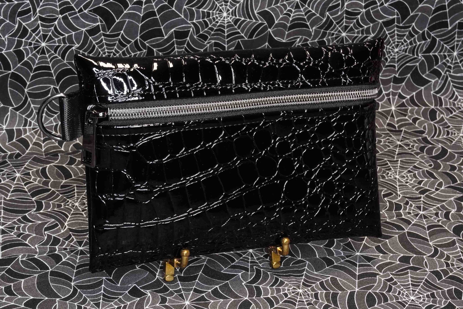 Compact yet practical, this small pouch is perfect for stashing your makeup brushes, pens, small tools, or daily essentials. The structured vinyl gives it a luxe feel with just the right amount of shine, making it a killer addition to any spooky or alternative wardrobe.